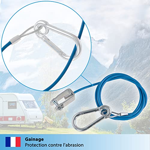 MATÉRIAU : câble en acier galvanisé gainé (PVC, bleu), mousqueton et œillet en acier galvanisé